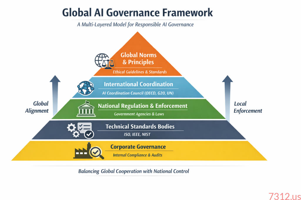 Artificial intelligence governance in 2026 is fragmented across national regulations, international principles, voluntary standards, and corporate policies. While numerous frameworks exist—including ethical guidelines, risk-management standards, and legally binding regulations—there is no unified global governance structure capable of coordinating these efforts. This essay proposes a realistic global AI governance architecture built on layered institutions rather than centralized authority. Drawing from existing international governance models and emerging AI policy instruments, the proposed system combines global norms, regulatory coordination, national enforcement, technical standards, and corporate oversight. The goal is not perfect global control of artificial intelligence but interoperable governance mechanisms that mitigate systemic risks while preserving innovation.
