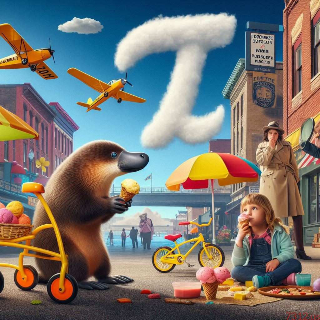 The prompt was: "Imagine a funny story that involve a platypus, Kalamazoo, an airplane, a tricycle, the number pi, twin sisters, ice cream, the color yellow, and a forensic specialist"